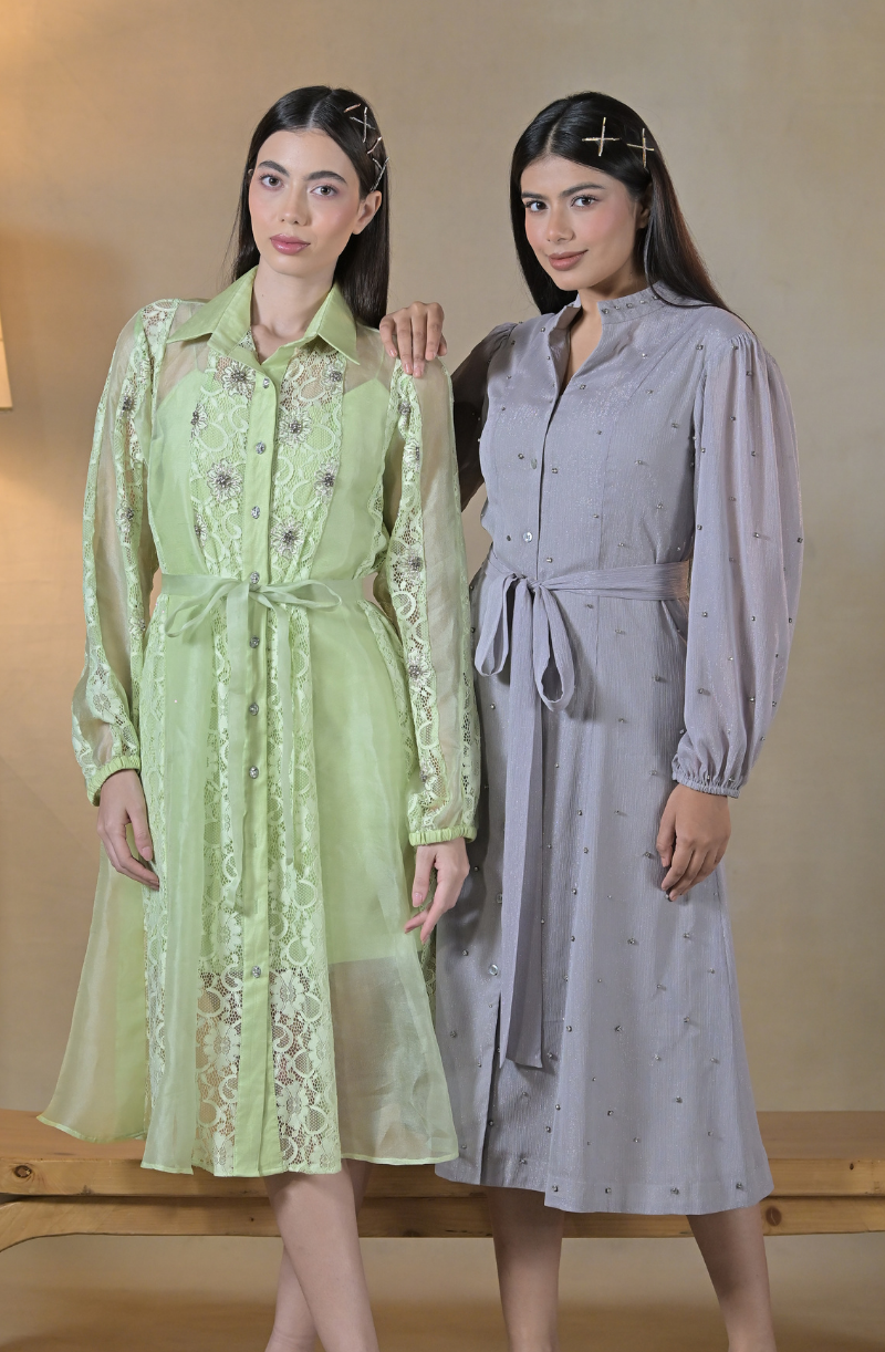 Description- Front Button Closure Dress With Embroidery Detailing, Waist Tie Belt